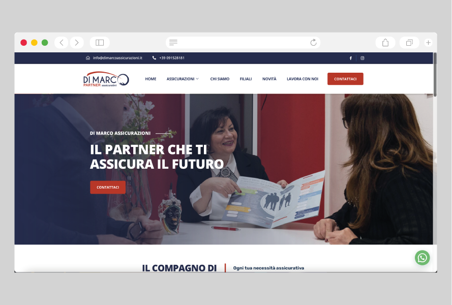 Dopo aver creato il logo aziendale, la costruzione della brand identity si è concentrata sulla realizzazione del sito vetrina (https://www.dimarcoassicurazioni.it) che ha permesso di all'azienda di cominciare a sfruttare tutti i vantaggi della comunicazione online. Il sito è stato costruito con l'obiettivo di rappresentare un servizio personalizzato e basato sull’ascolto del cliente, di trasmettere all'utente tutti i valori intrinsechi dell'identità del marchio realizzato ma sopratutto di permettere all'utente di poter visionare tutte le tipologie di polizze offerte e avere un'esperienza semplice ma efficace.