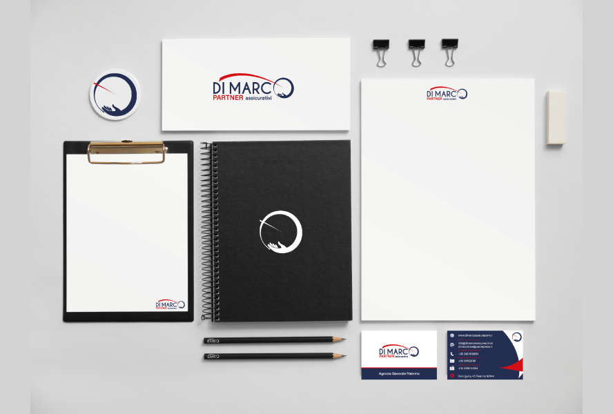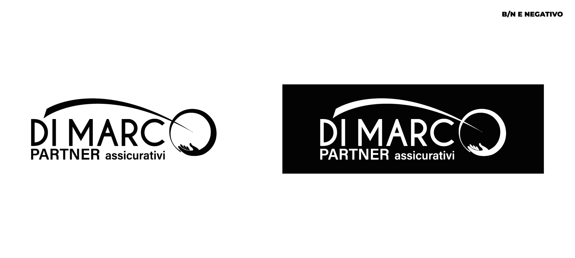 La realizzazione della brand identity di Di Marco Partner Assicurativi è stata progettata con l'obiettivo di rappresentare la sicurezza e la serenità che l'azienda offre. La traduzione visiva di questo concetto viene indentificata nell'astrazione di un percorso delineato e definito dall'arco posizionato sopra il nome. Il cerchio, come simbolo della vita, definisce l'individuo che percorre il cammino costruito insieme al proprio consulente. La scelta di sostituire la lettera o con il cerchio è stata fatta per creare equilibrio all'interno del pittogramma e per sottolineare l'inizio e la fine del percorso di fiducia. Inoltre, l'intersezione della linea rossa che parte dal centro del cerchio, quindi del percorso, viene associata alla costruzionedi una rete di partner cresciuta nel tempo, nella quale si condividono i valori all'equilibrio, alla stabilità e alla serenità.
