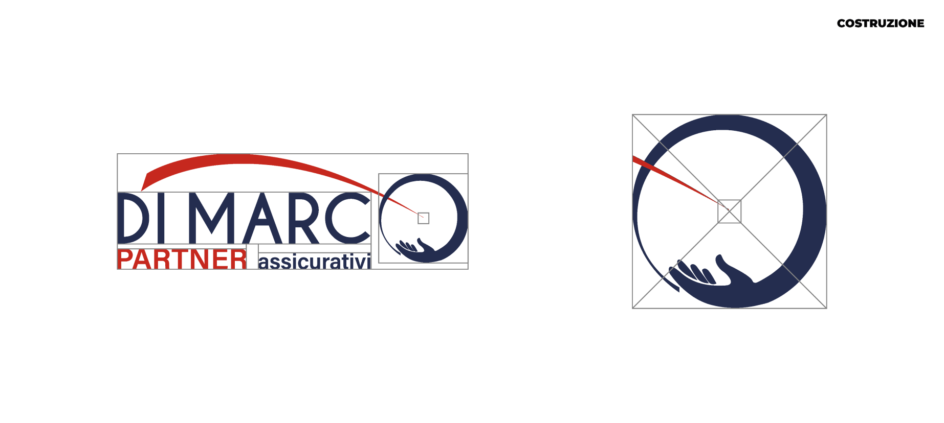 La realizzazione della brand identity di Di Marco Partner Assicurativi è stata progettata con l'obiettivo di rappresentare la sicurezza e la serenità che l'azienda offre. La traduzione visiva di questo concetto viene indentificata nell'astrazione di un percorso delineato e definito dall'arco posizionato sopra il nome. Il cerchio, come simbolo della vita, definisce l'individuo che percorre il cammino costruito insieme al proprio consulente. La scelta di sostituire la lettera o con il cerchio è stata fatta per creare equilibrio all'interno del pittogramma e per sottolineare l'inizio e la fine del percorso di fiducia. Inoltre, l'intersezione della linea rossa che parte dal centro del cerchio, quindi del percorso, viene associata alla costruzionedi una rete di partner cresciuta nel tempo, nella quale si condividono i valori all'equilibrio, alla stabilità e alla serenità.